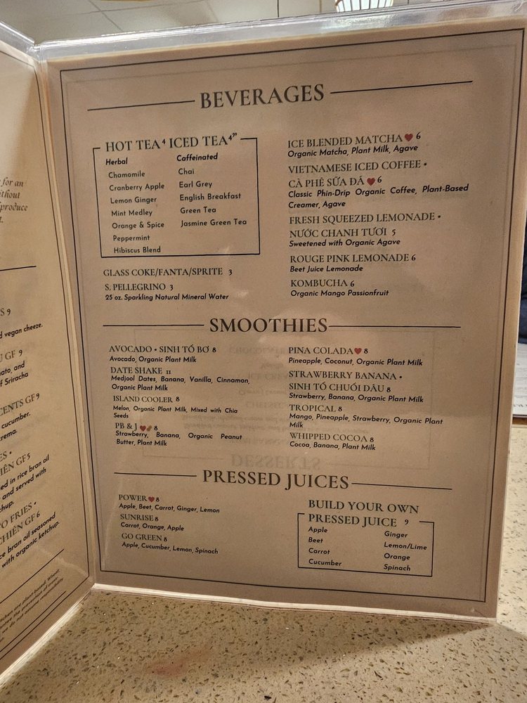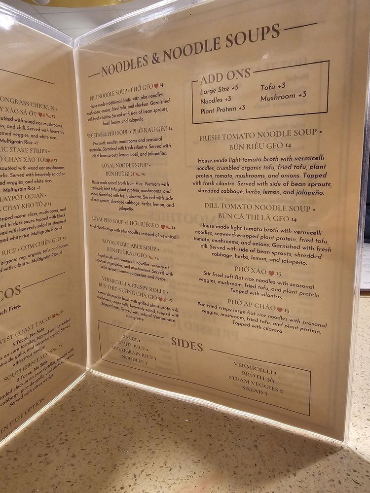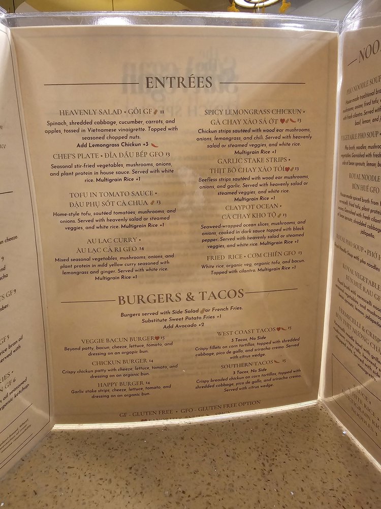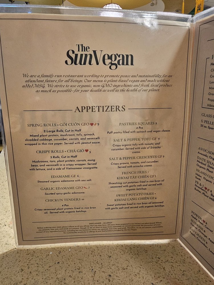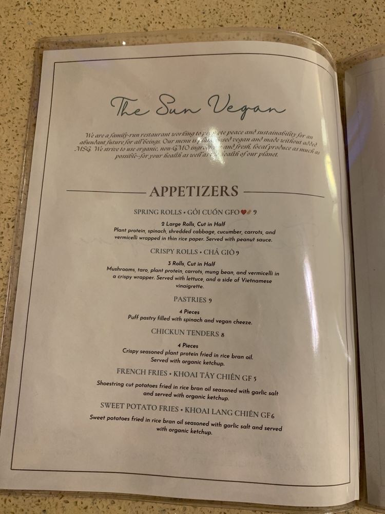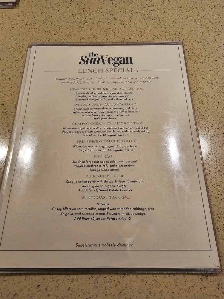 Introducing The Sun Vegan, a vegan Vietnamese restaurant located in Fountain Valley, CA. With a focus on plant-based dishes, The Sun Vegan offers a wide array of options including bun rieu, bun bo hue, pho, lemongrass chickun, and pandan cake. Customers rave about the fresh and flavorful food, highlighting favorites like the Bun Bo Hue, Spring Rolls, and Lemongrass Chicken. The cozy atmosphere, attentive service, and creative menu make it a top choice for those seeking delicious vegan cuisine. Whether you're a dedicated vegan or just looking to try something new, The Sun Vegan is sure to impress with its diverse and satisfying dishes. Don't miss out on this hidden gem that offers a unique dining experience for all.